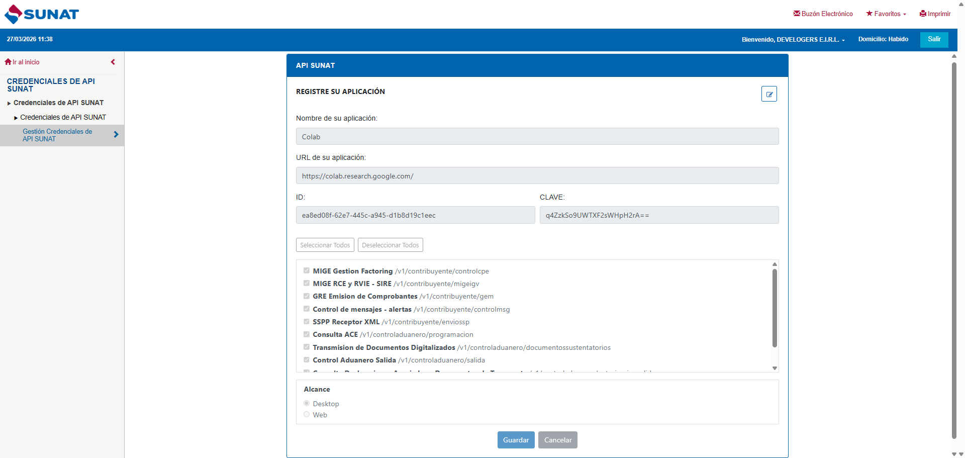 Finalmente proceder a guardar y aceptar los datos de la aplicación. Se generarán el ID y la CLAVE, credenciales que deberá registrar en su sistema de facturación electrónica.